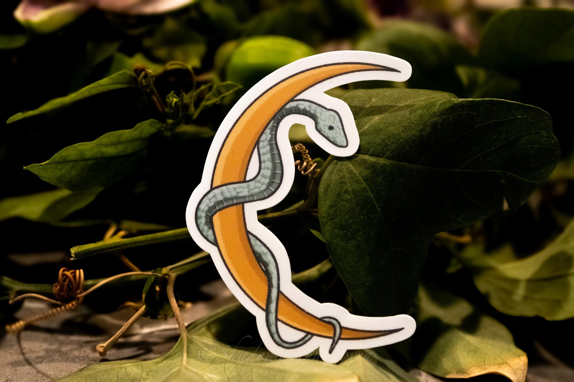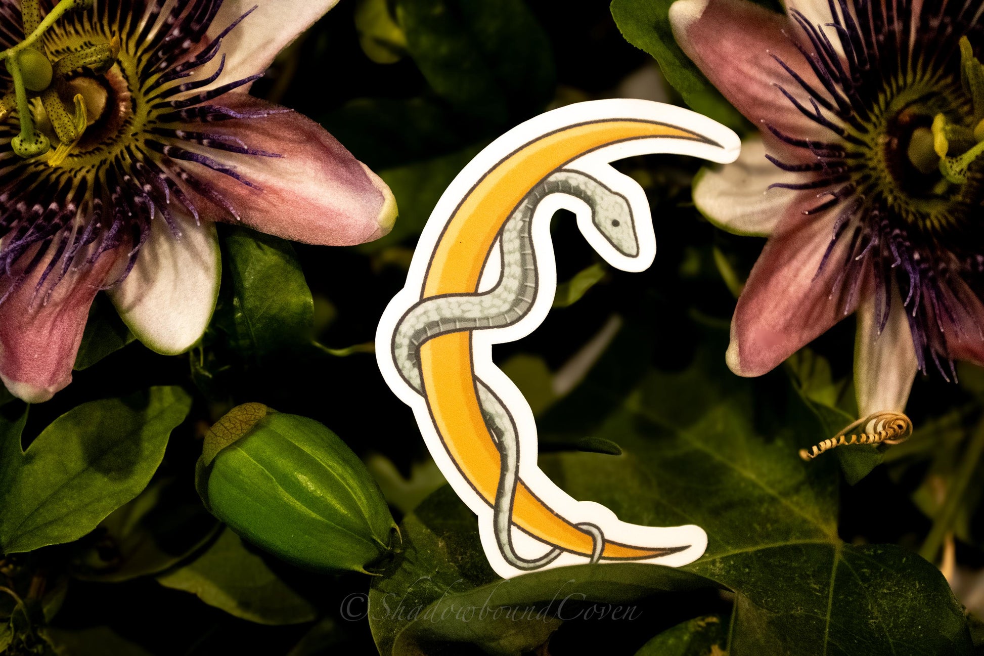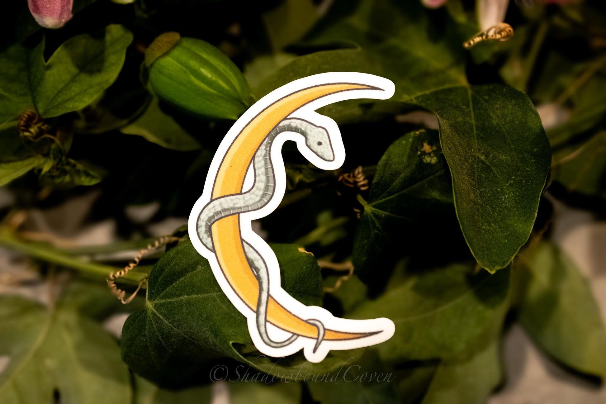 Enhance any surface with our Waterproof Sticker. Featuring a Crescent moon with a winding snake, this sticker adds a touch of nature-inspired elegance to your laptop, water bottle, or journal.