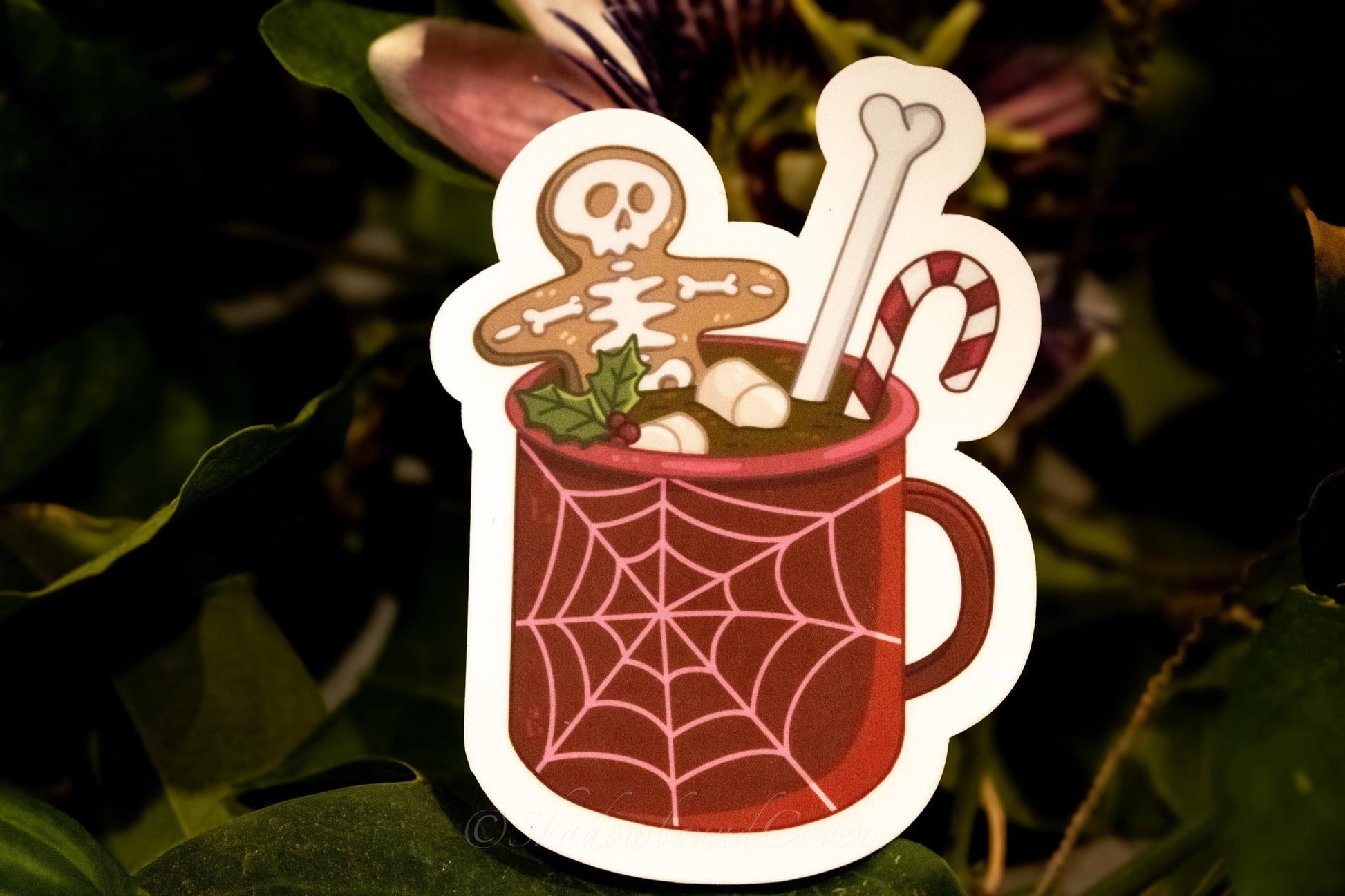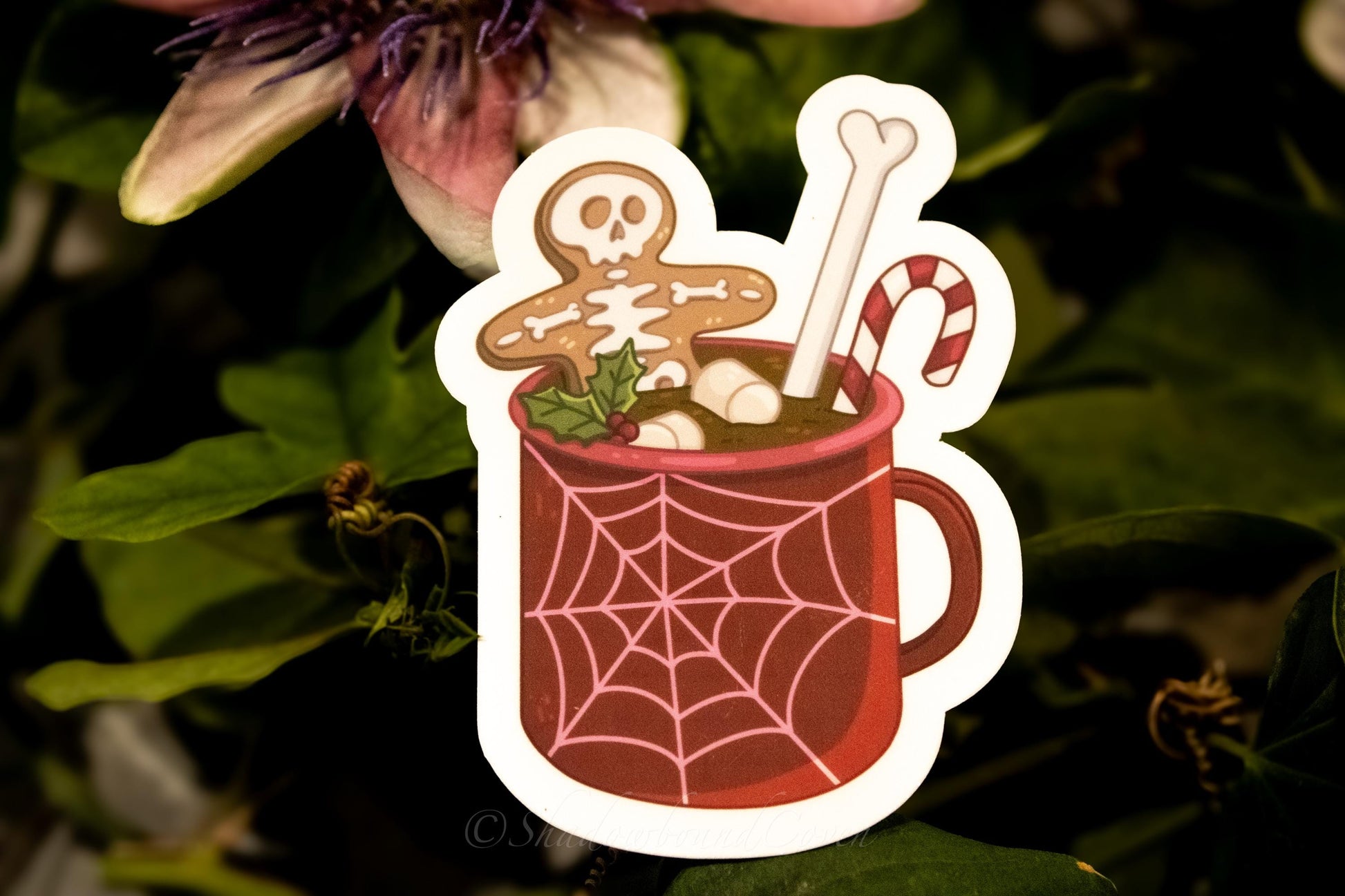 Enhance any surface with our Waterproof Sticker. Featuring Dark hot cocoa, gingerbread skeleton, and holly, this sticker adds a touch of nature-inspired elegance to your laptop, water bottle, or journal.