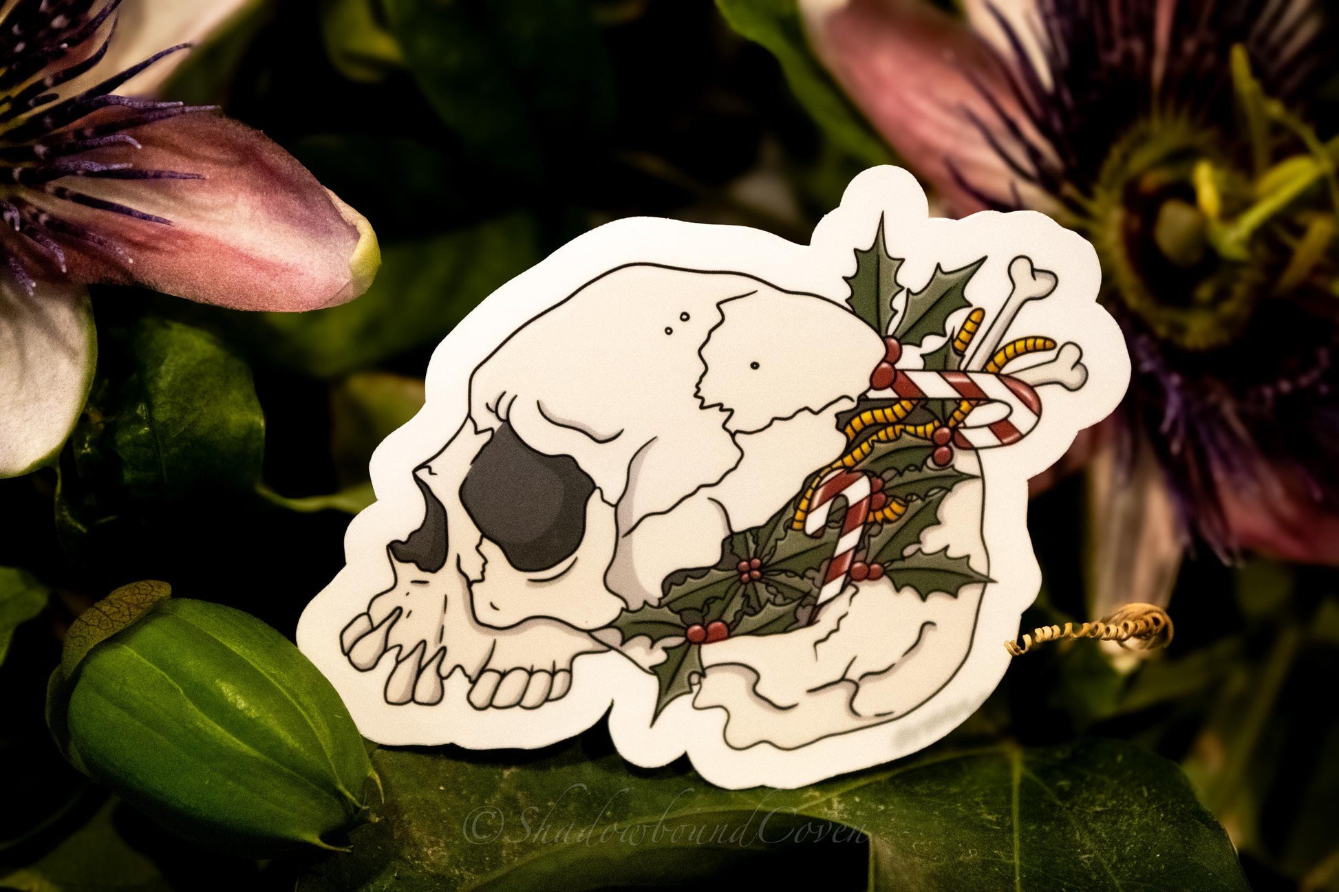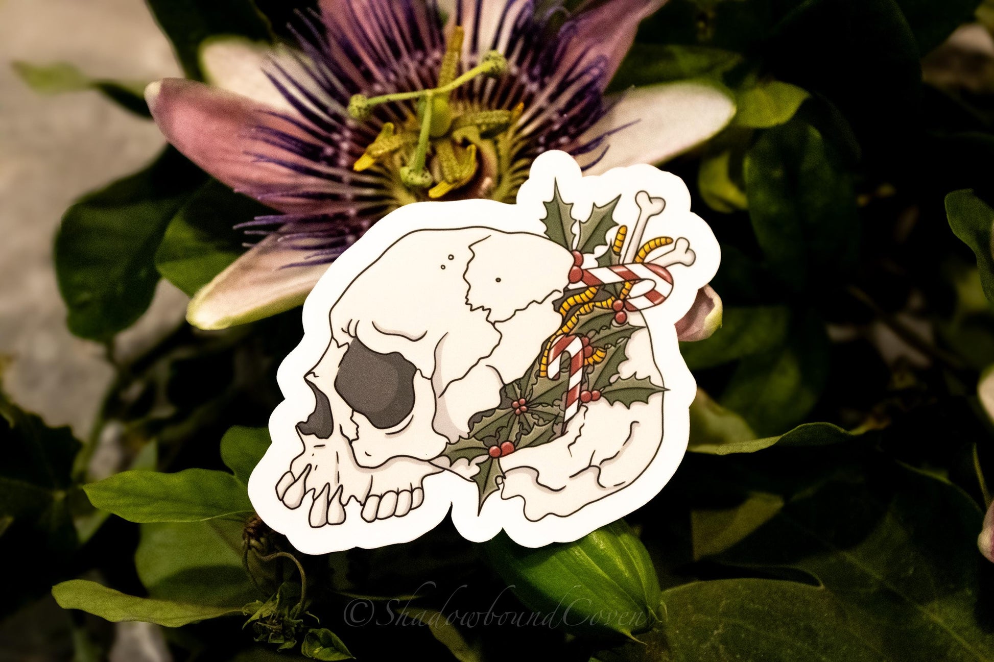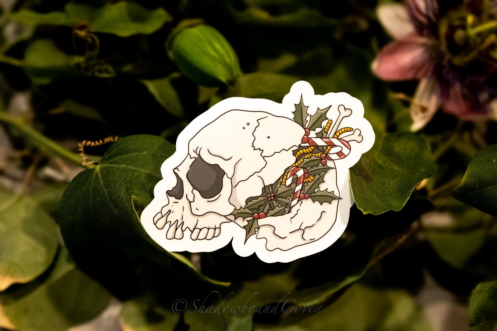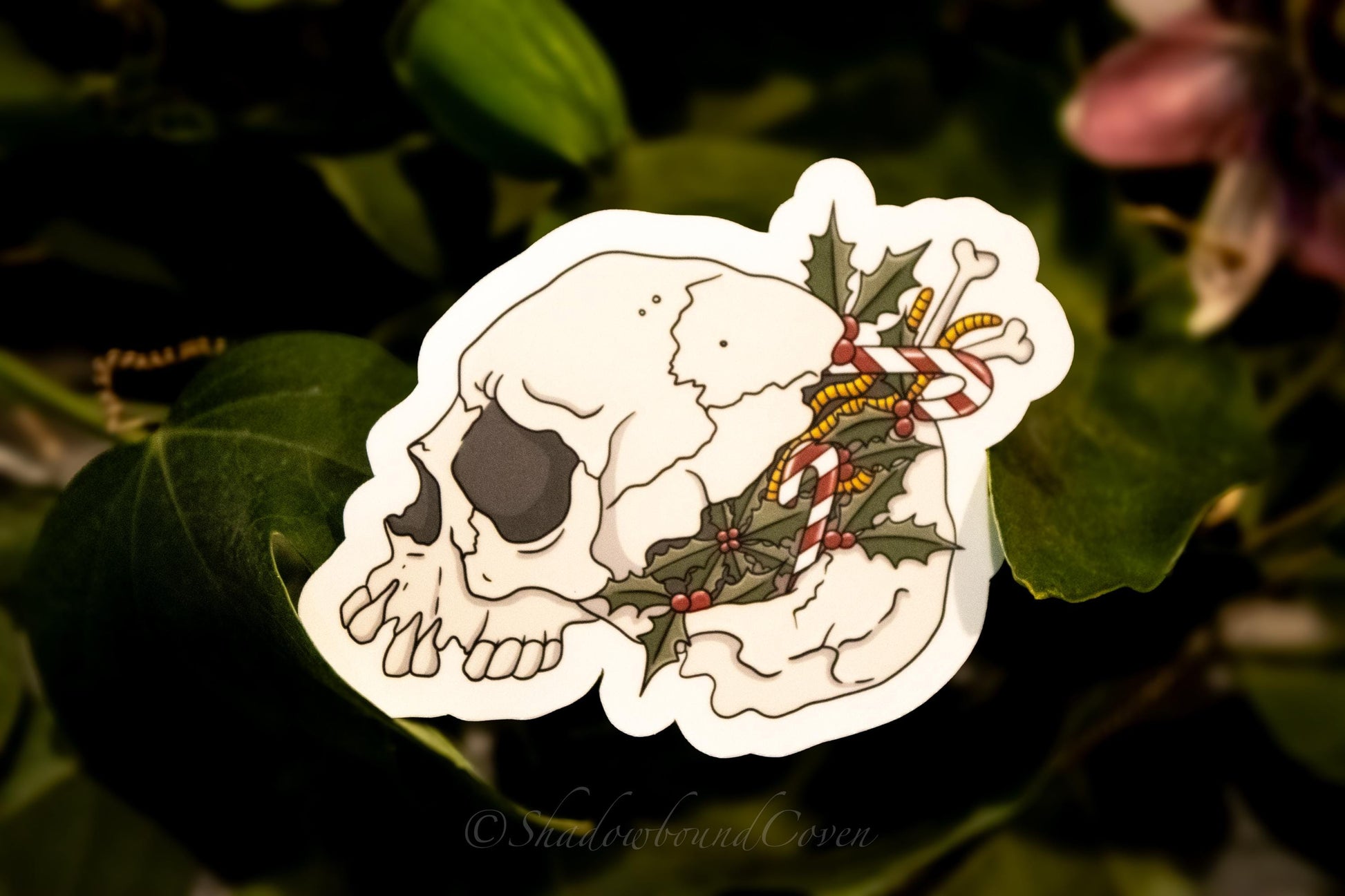 Enhance any surface with our Waterproof Sticker. Featuring a Skull with a Christmas Candy Cane and holly, this sticker adds a touch of nature-inspired elegance to your laptop, water bottle, or journal.