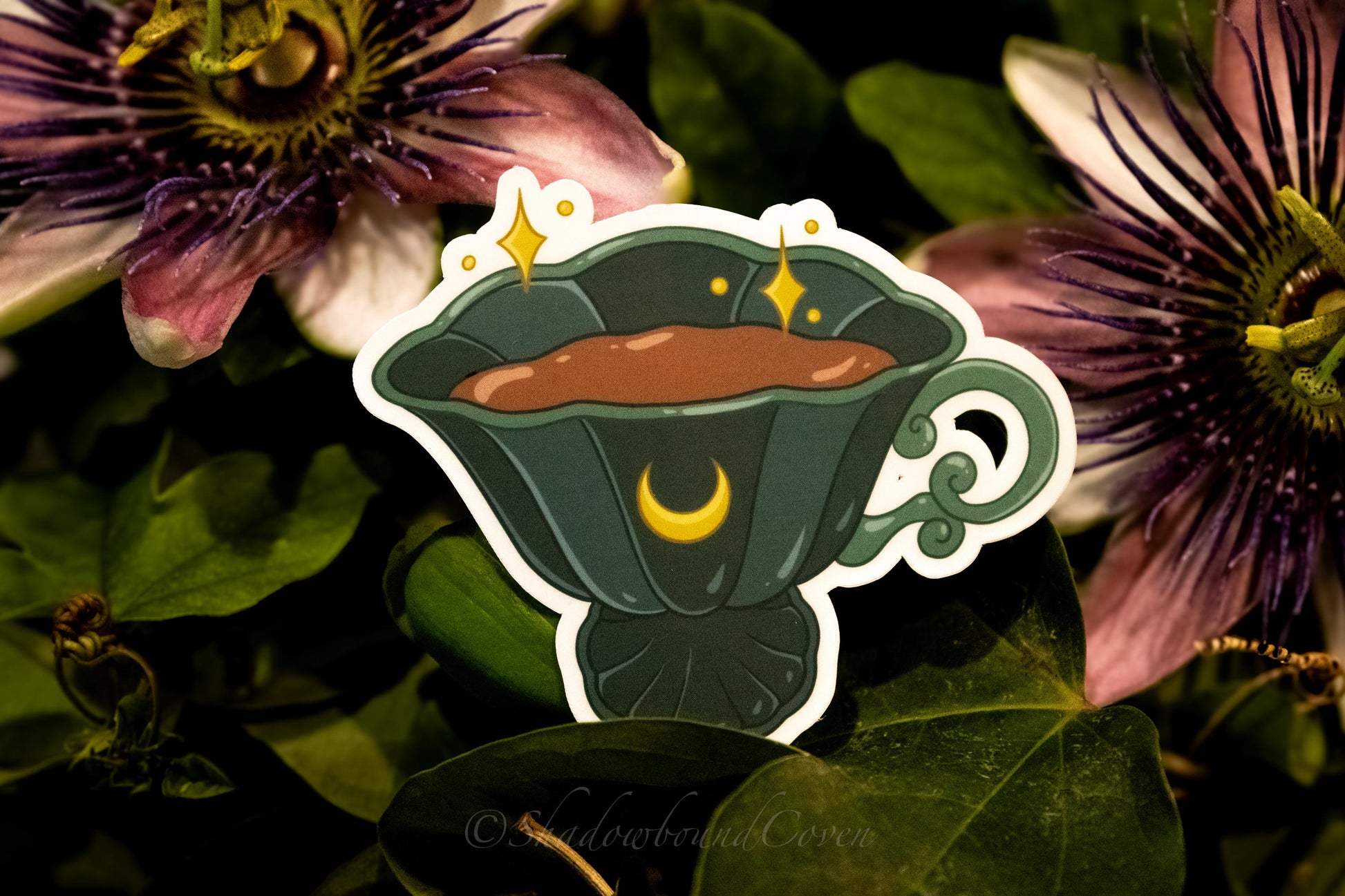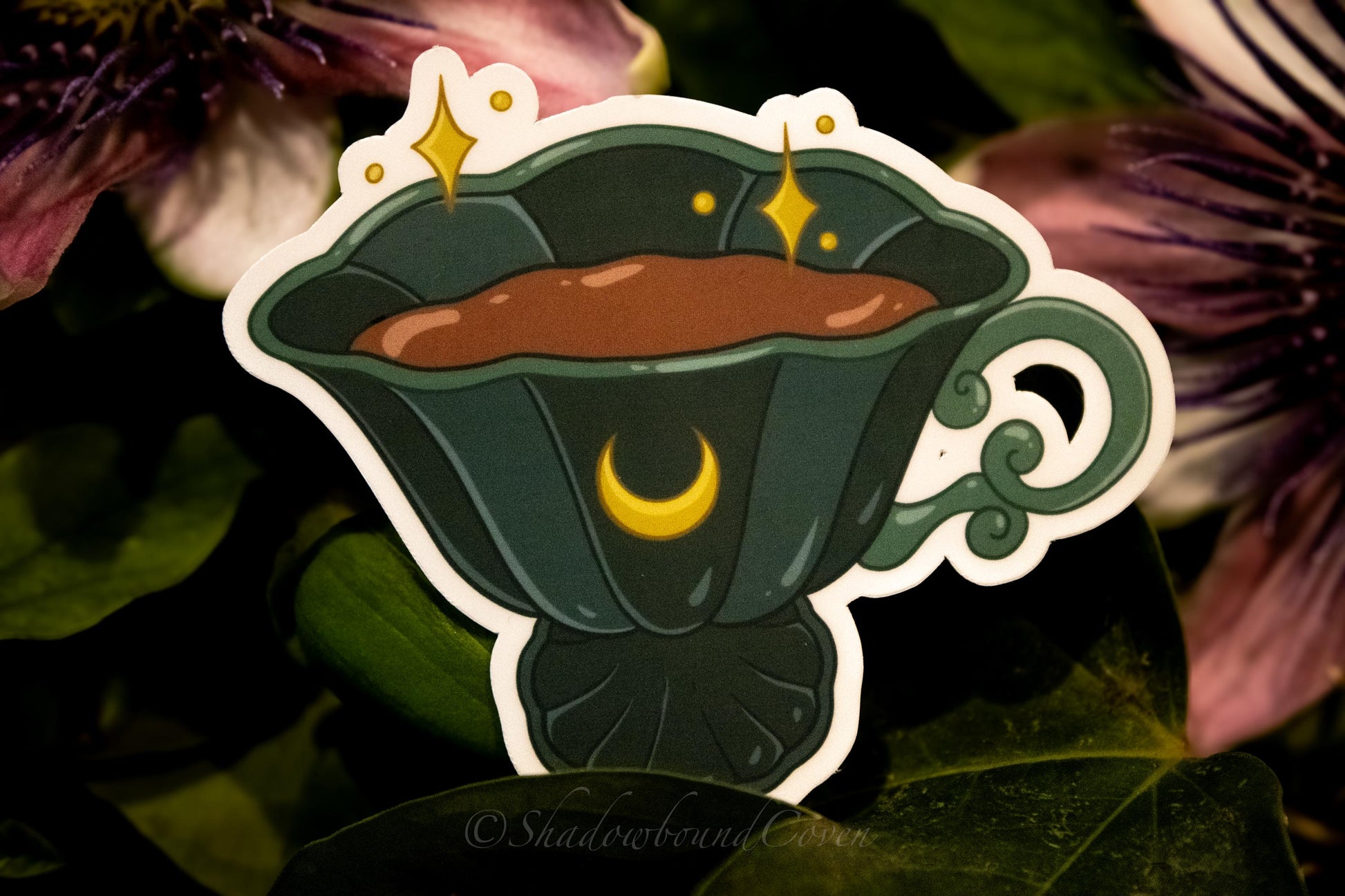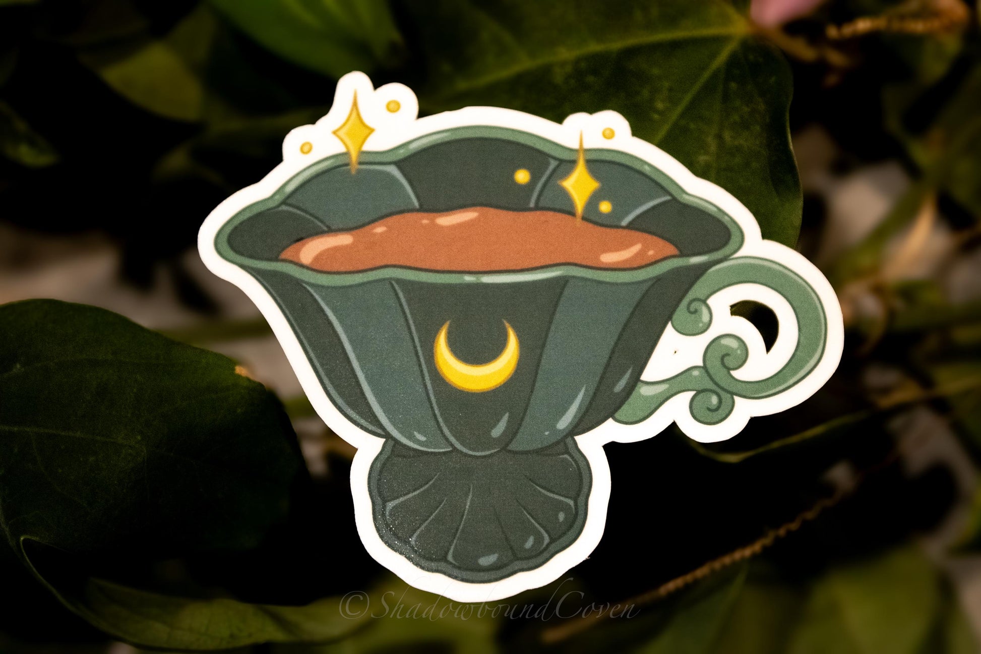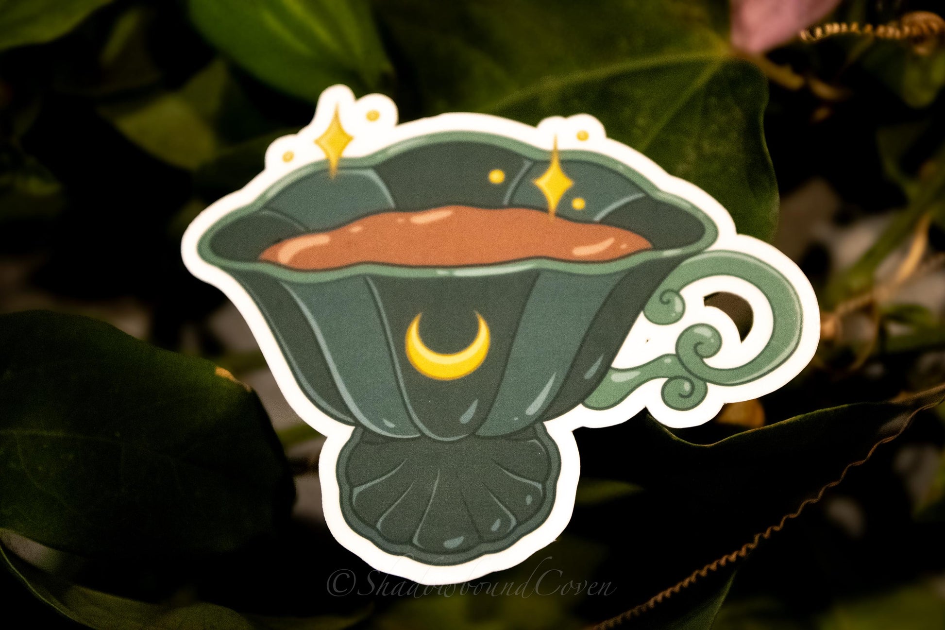 Enhance any surface with our Waterproof Sticker. Featuring a Teacup with Crescent Moon, this sticker adds a touch of nature-inspired elegance to your laptop, water bottle, or journal.