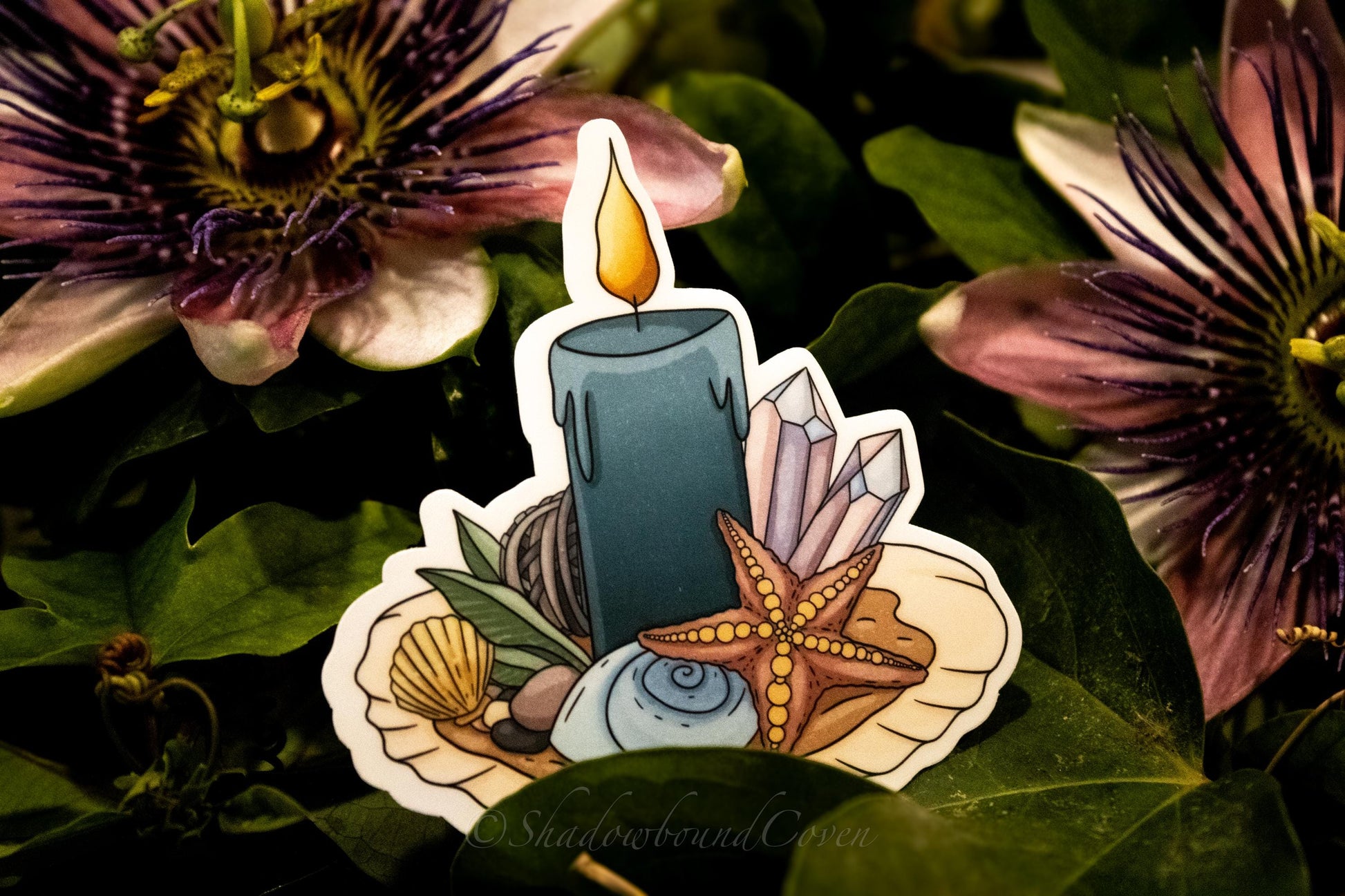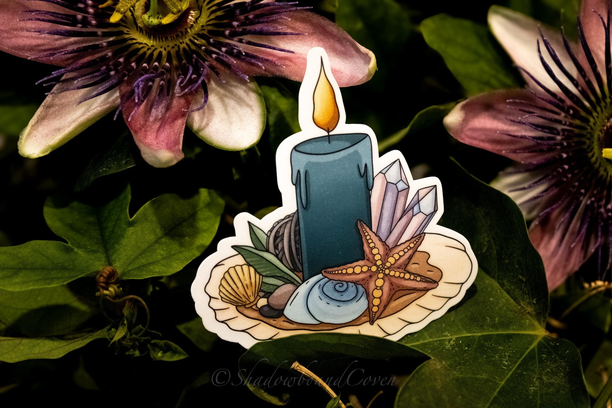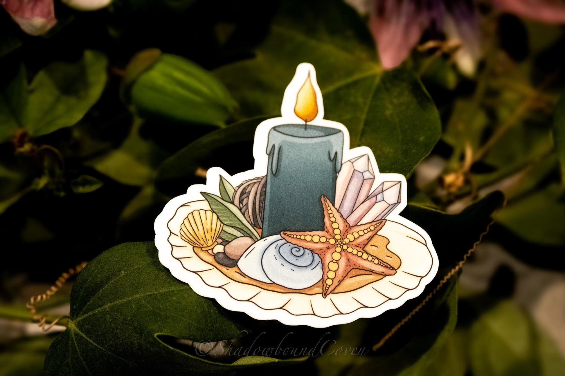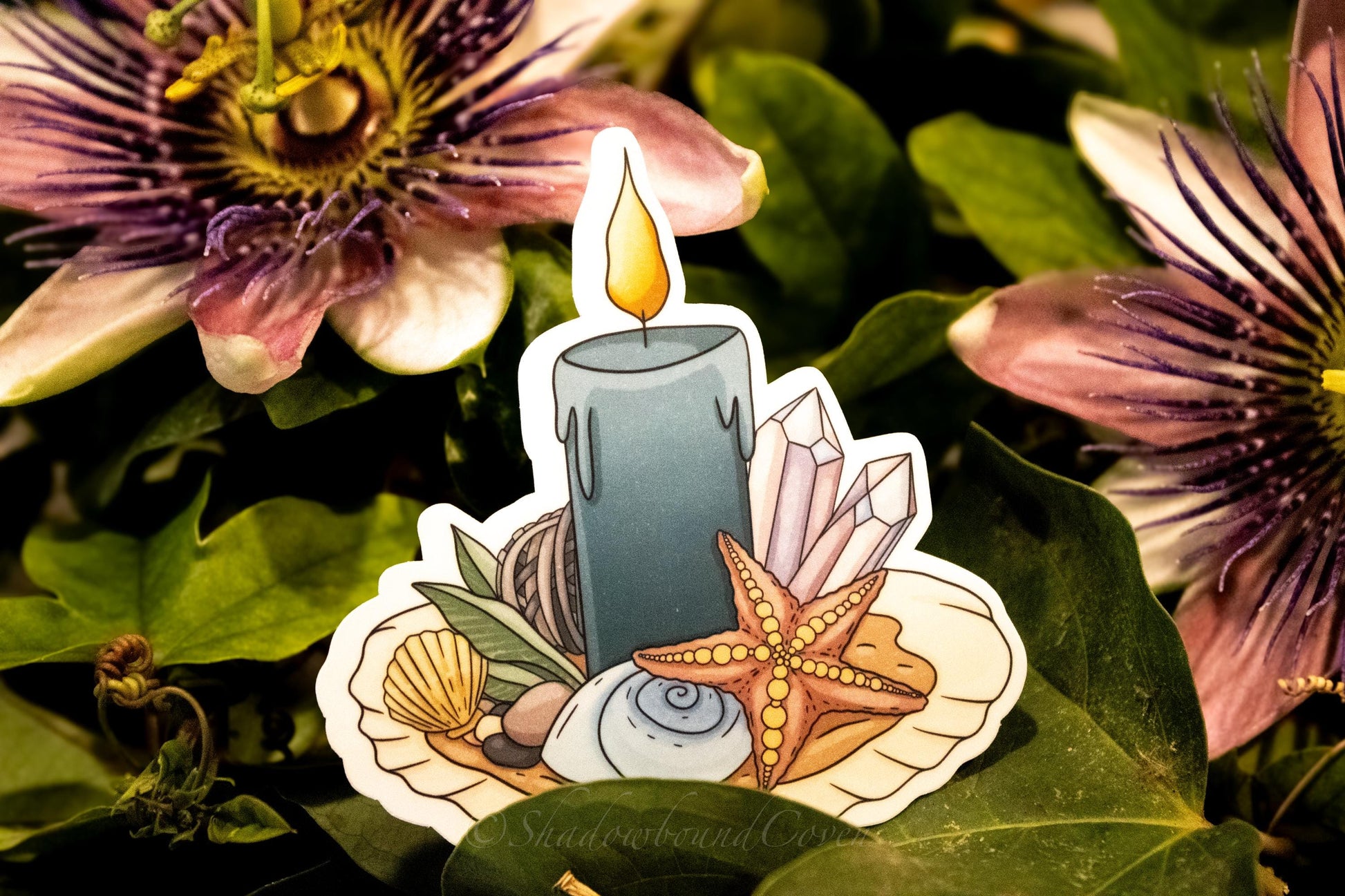 Enhance any surface with our Waterproof Sticker. Featuring a Candle with shells and sea items around it, this sticker adds a touch of nature-inspired elegance to your laptop, water bottle, or journal.