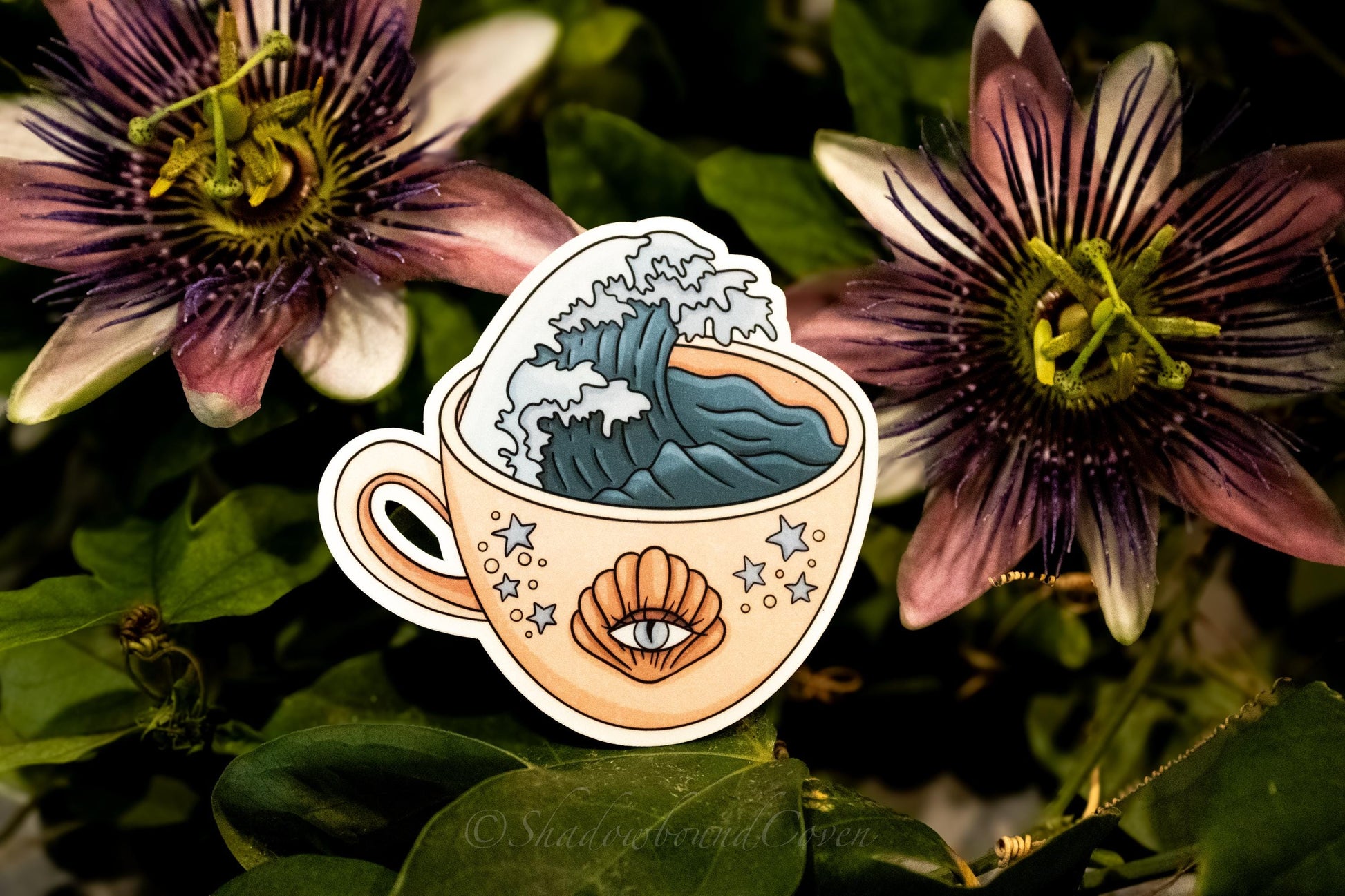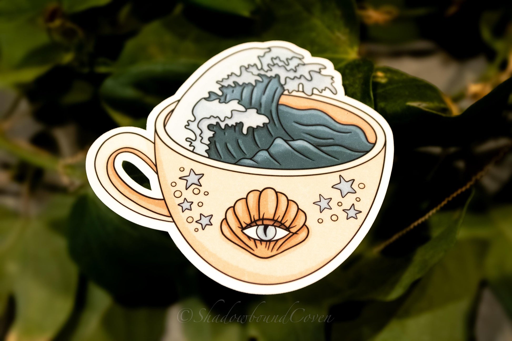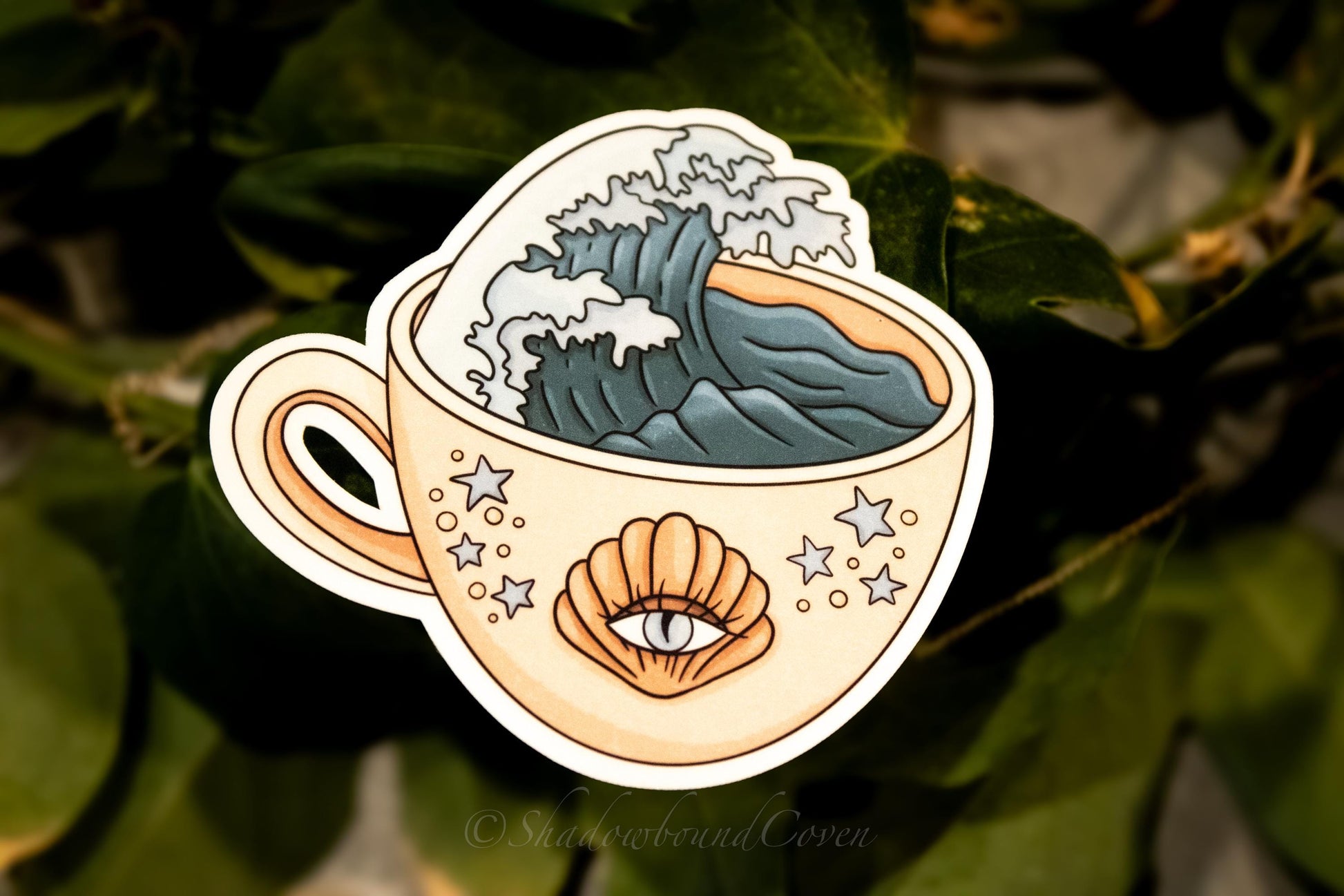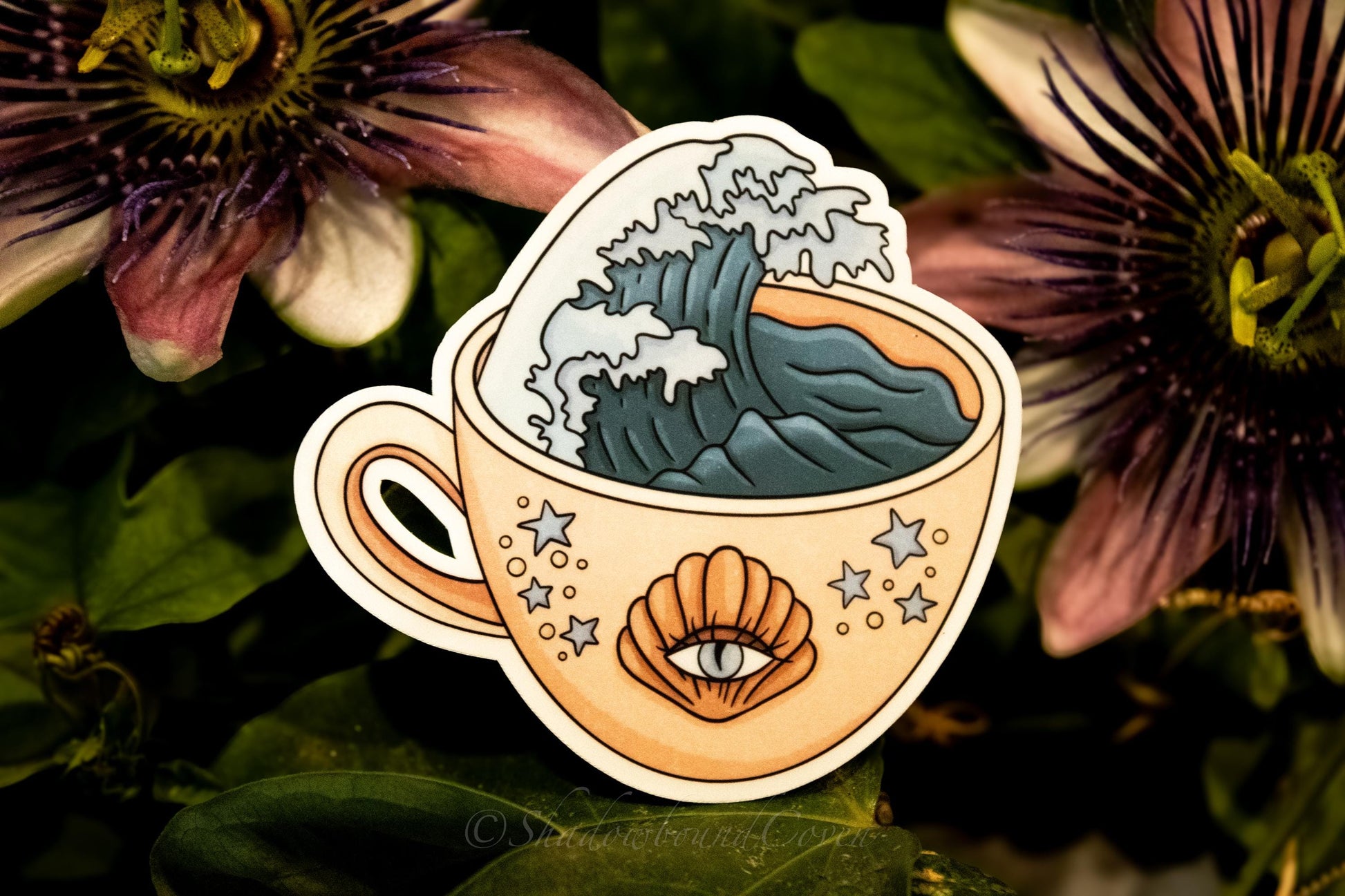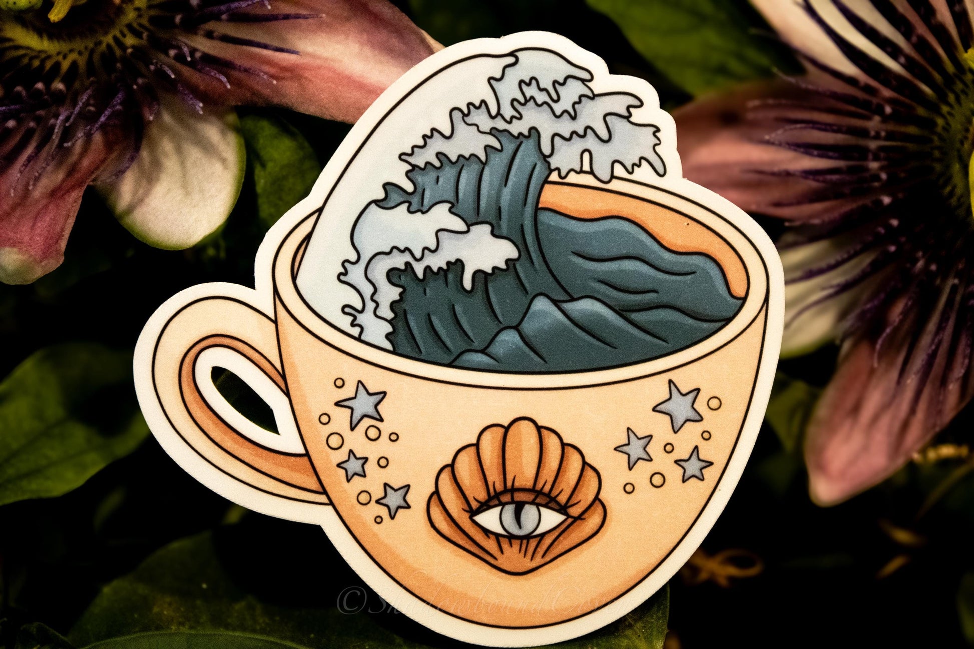 Enhance any surface with our Waterproof Sticker. Featuring a Tea cup with an ocean wave crashing inside, this sticker adds a touch of nature-inspired elegance to your laptop, water bottle, or journal.