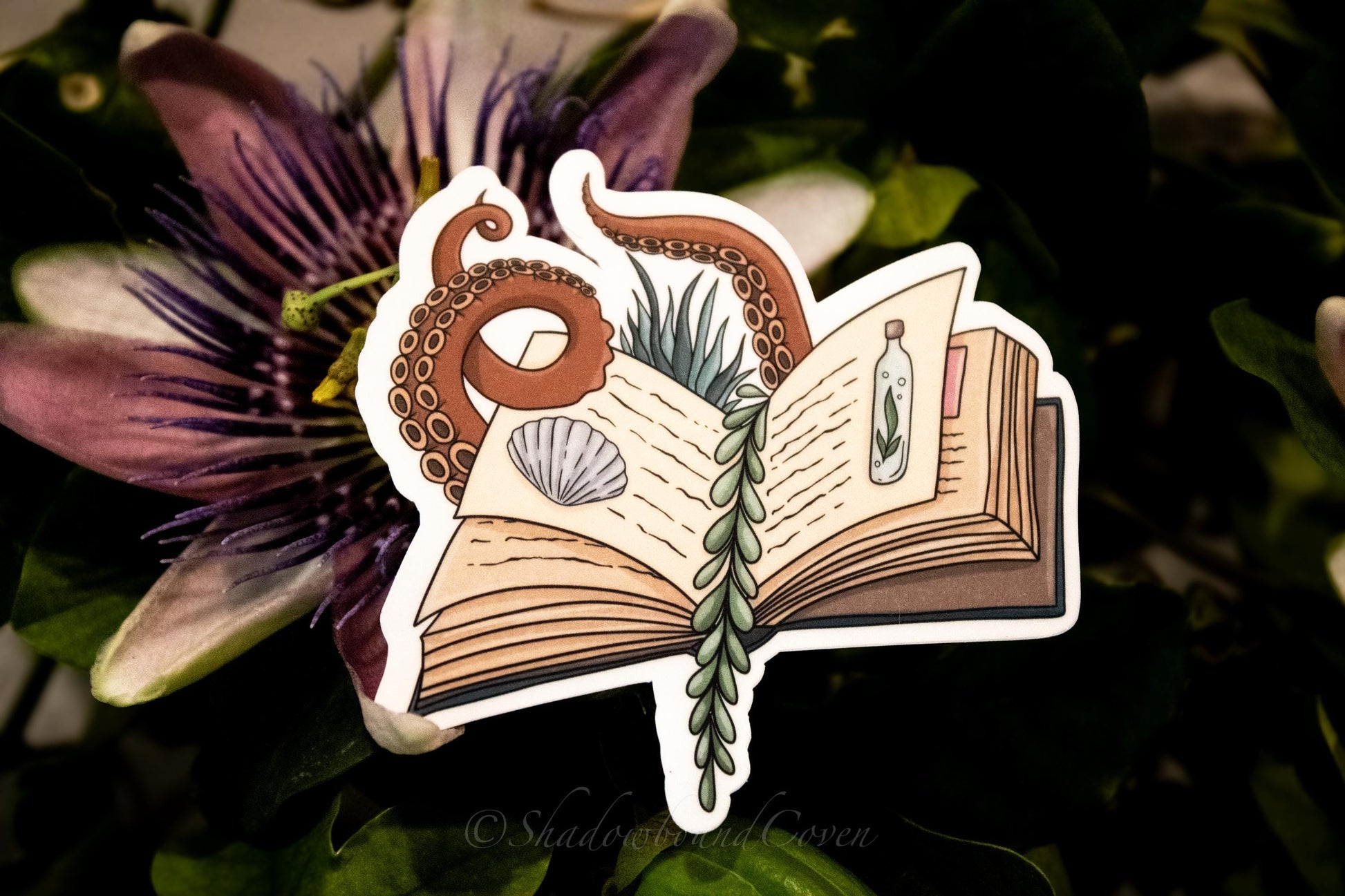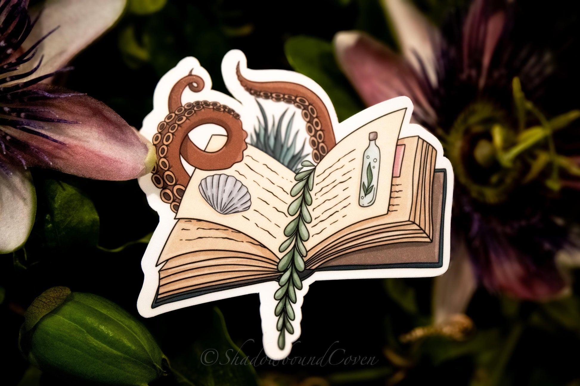Enhance any surface with our Waterproof Sticker. Featuring an Oceanic Tentical and Seaweed Book, this sticker adds a touch of nature-inspired elegance to your laptop, water bottle, or journal.