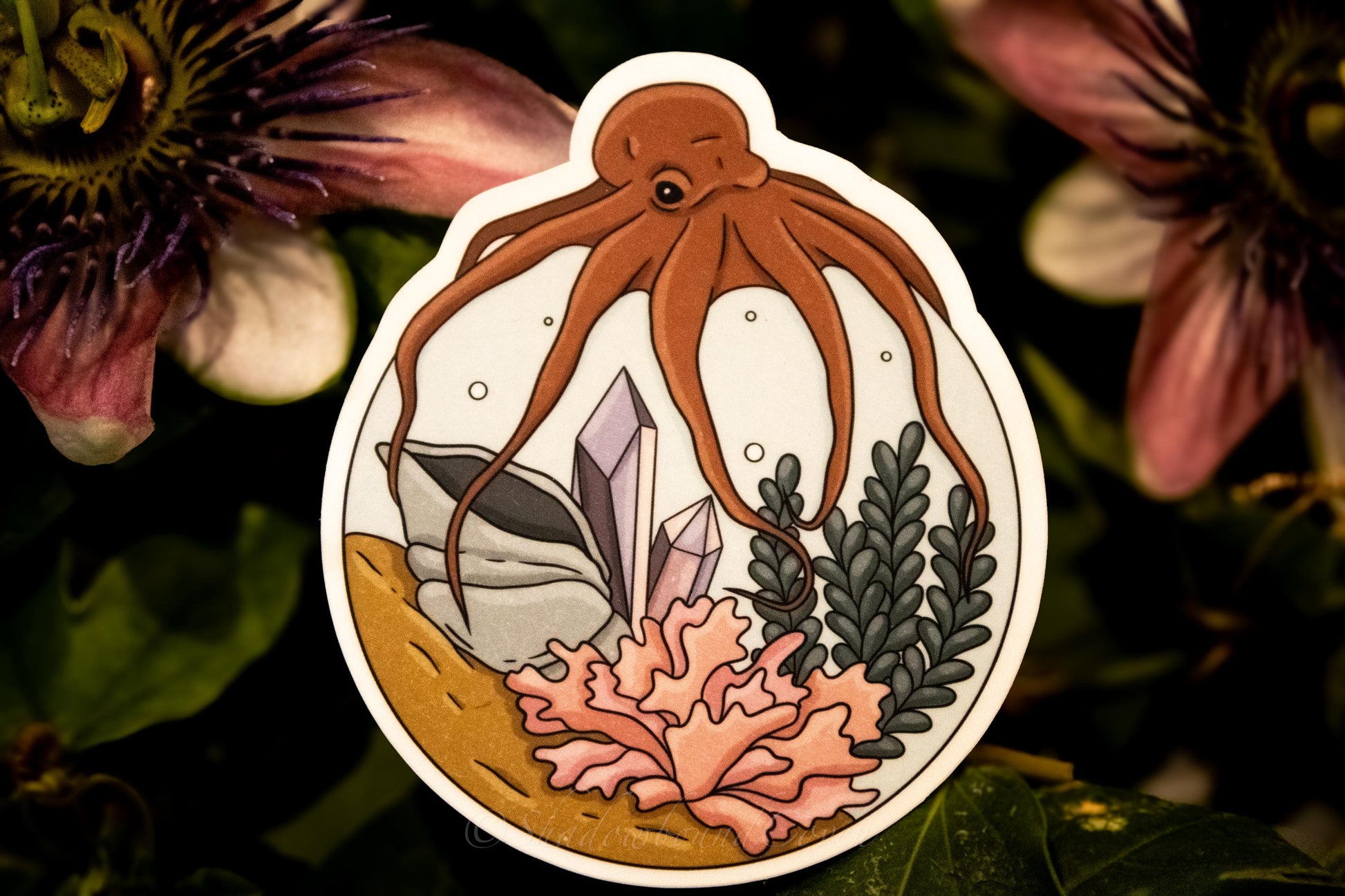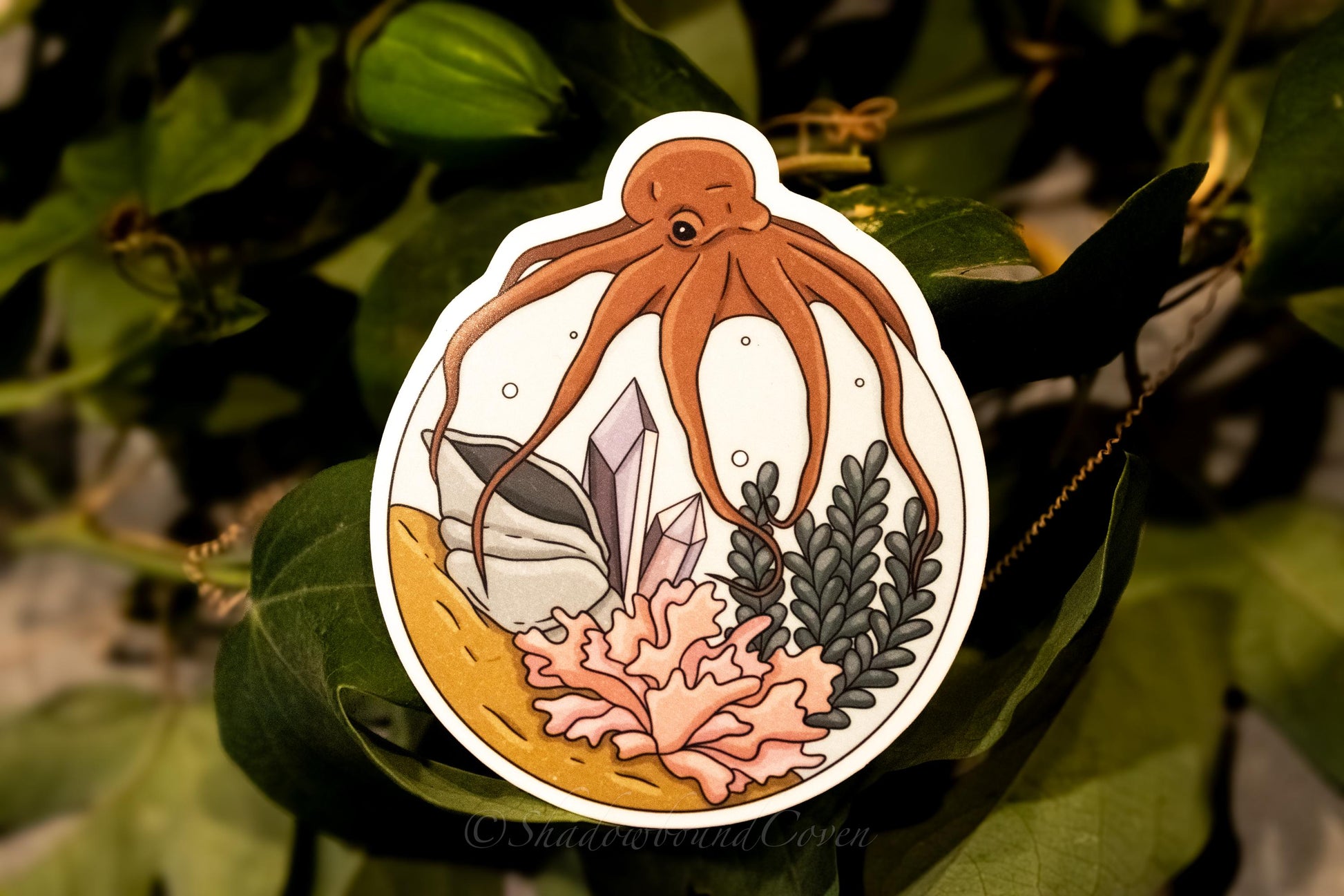 Enhance any surface with our Waterproof Sticker. Featuring an Oceanic Terrarium with an Octopus, this sticker adds a touch of nature-inspired elegance to your laptop, water bottle, or journal.